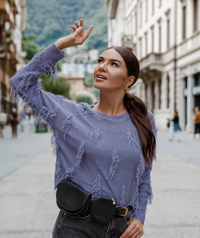 Укорочений джемпер приглушеного лавандового відтінку з круглим вирізом, довгим рукавом, фігурним низом і ефектним декором у вигляді витонченої бахроми. Колір: блакитний Матеріал: в'язка Склад: акрил 70% поліамід 30% UN Грудь96 - 106 Талия92 - 106