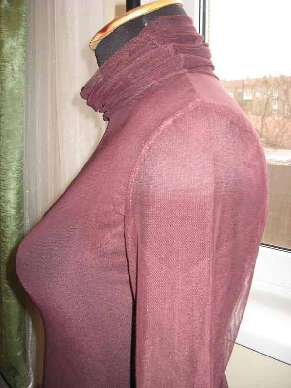 Жіноча водолазка-сітка з красивим коміром. Колір незвичайний шоколадно-бордовий, сітка м'яка і приємна у тіла, добре тягнеться. Ог 96-100см, Про 100-104см, довжина рукава 61-62cm, висота коміра 38см (збирається в драпіровку), ширина спинки 41-42см. Т. к. матеріал еластичний можна рекомендувати на 46-48-50 р-н. Ручна робота, одинична річ.