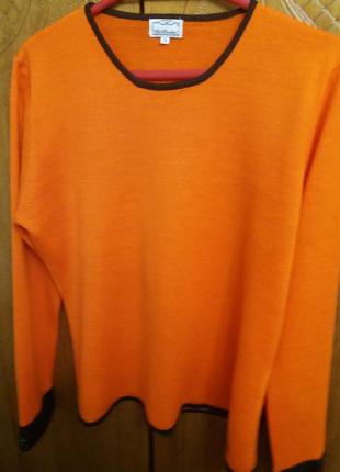 Джемпер яркого оранжевого цвета с коричневой окантовкой. На рукавах манжеты с пуговичками. Выглядит ярко и стильно. Состав:шерсть - 50%, акрил - 50%. Длина - 61см. ПОГ - 54 см. ПОБ - 55 см. Длина рукава - 63 см.