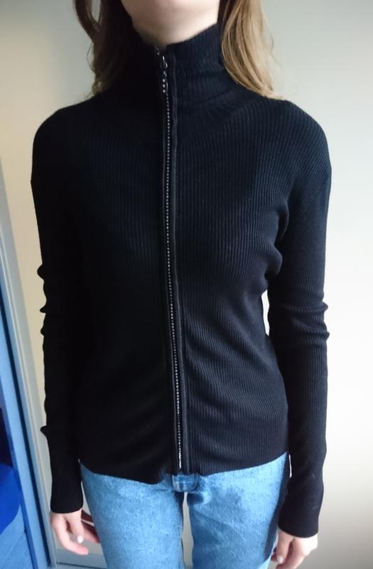 Чорна трикотажна кофта на блискавці з страз, р. S / M, в відмінному стані, не розтягнута, комір стійка, підходить на худу дівчину ростом до 173. 70% віскоза, 20% нейлон, 10% спандекс.