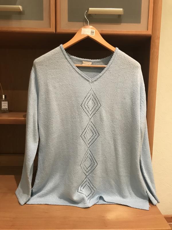 Джемпер ніжно блакитного кольору, довжина 72 см, ширина по грудях 60 см, довжина рукава 60 см, ширина плечей 48 см