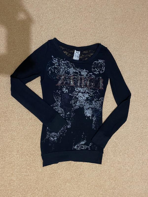 Кофточка з декором на грудях у вигляді страз, на спинці по лопатках вставка мереживо. Довжина від плеча 63 см, від пахви до пахви 37 см, довжина рукава 62 см