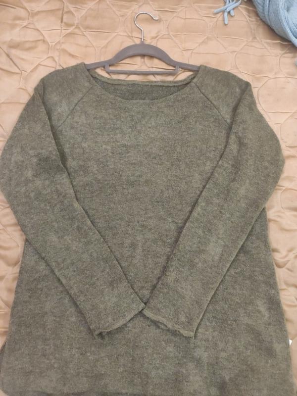 Симпатичний джемпер.Колір хакі.У бокових швах два зіпера.Можна розщібнути і буде два розрізики.Приємний колір злегка меланж.Цікавий відтінок кольору хакі.В'язка трішки ніби з кормом.Підійде на 40,42 європейський.ПОГ 54 див. Довж.рукава від горловини 63 см (рукав реглан) Довжина джемпера 60см.Горловинп виріз "човник" .
