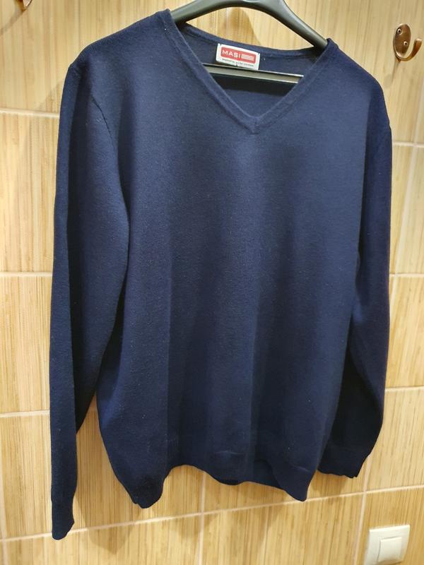 Джемпер темно синего цвета. Состав : шерсть 100% Длина - 60 см. Ширина - 56 см. Длина рукава - 58 см. Плечо - 12 см.