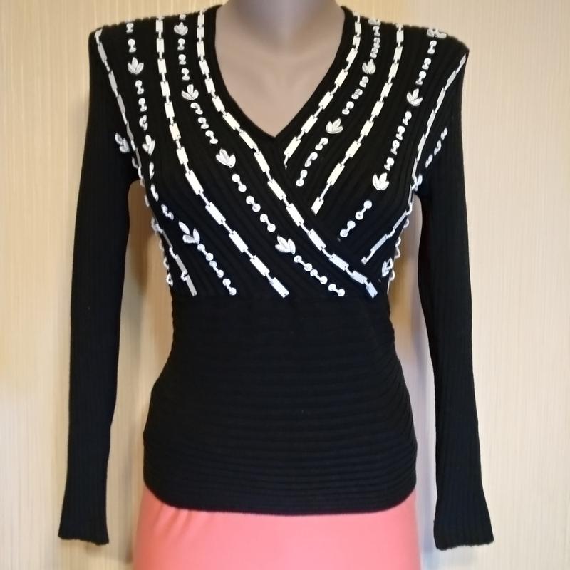 Черный трикотажный джемпер расшитый паетками и бисером.прекрасно подчеркивает достоинства фигуры.отлично тянется.. длина изделия-50см.длина рукава-55см.ПОГ-40см.торг уместен.(при покупке от двух лотов любой третий до 95гр. в подарок)