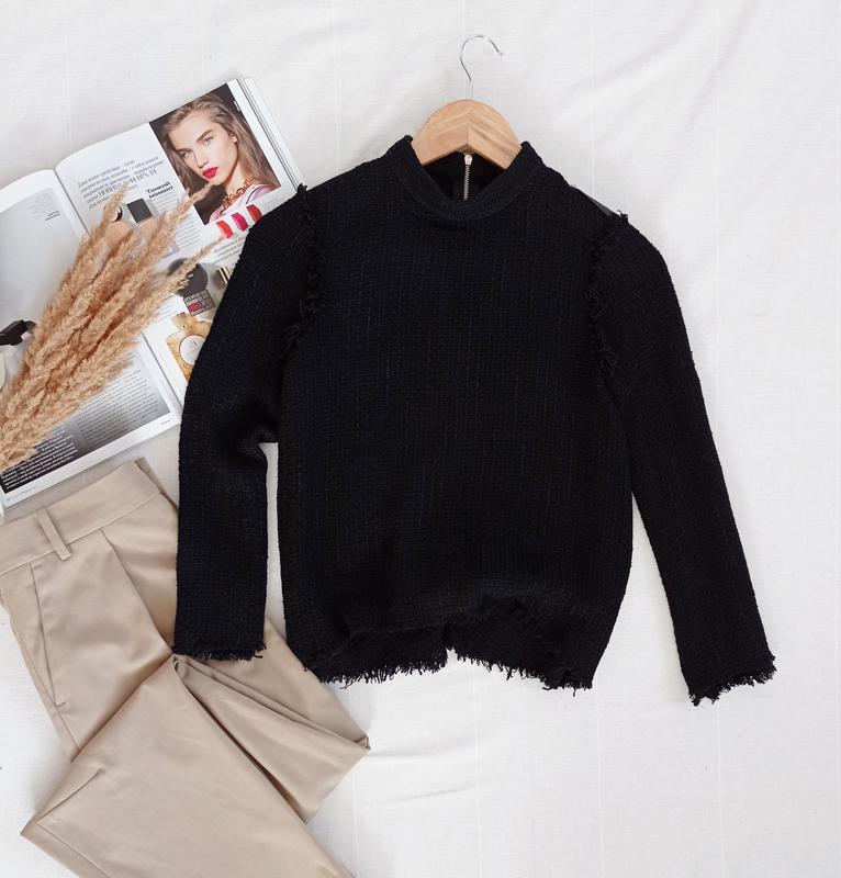 чорний джемпер твід від Zara ззаду на замку, зі стойкою, крій прямий з подовженою спиною, тканина твід котон, розмір XS, ПО грудей 43 см, довжина спереду 50 см, довжина спинки 60 см