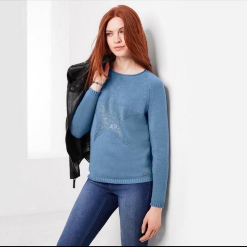 Мягкий хлопковый джемпер. Текстурная вязка и металлический накат. Рукав-реглан. Размер- RU-42-44. ПОгруди-46см, ПОниза-47см, Длина рукава от горловины-75см, Длина-61см.