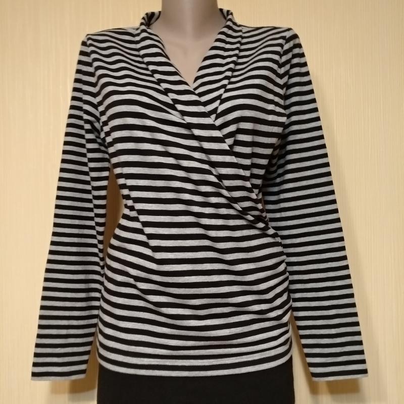 MARA MAY всегда ищет высококачественные,100%натуоальные гипоаллергенные волокна.поэтому этот трикотажный джемпер очень приятного качества,средней плотности в размеренную полоску с запахом в отличном состоянии..длина изделия-64см.длина рукава-63см.ПОГ-47см.ПОТ-43см.