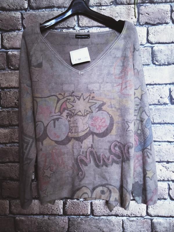 Фірмовий джемпер New Collection з ефектом татуювання. Неймовірно м'який та ніжний! У стилі татуювання- графіті по тілу. Розмір L Виміри: П/об під рукавами - 53см Плечо + рукав - 65см Довжина попереду – 61см Довжина ззаду - 64см Матеріал: 49% віскоза 23% поліамід 28% еластан