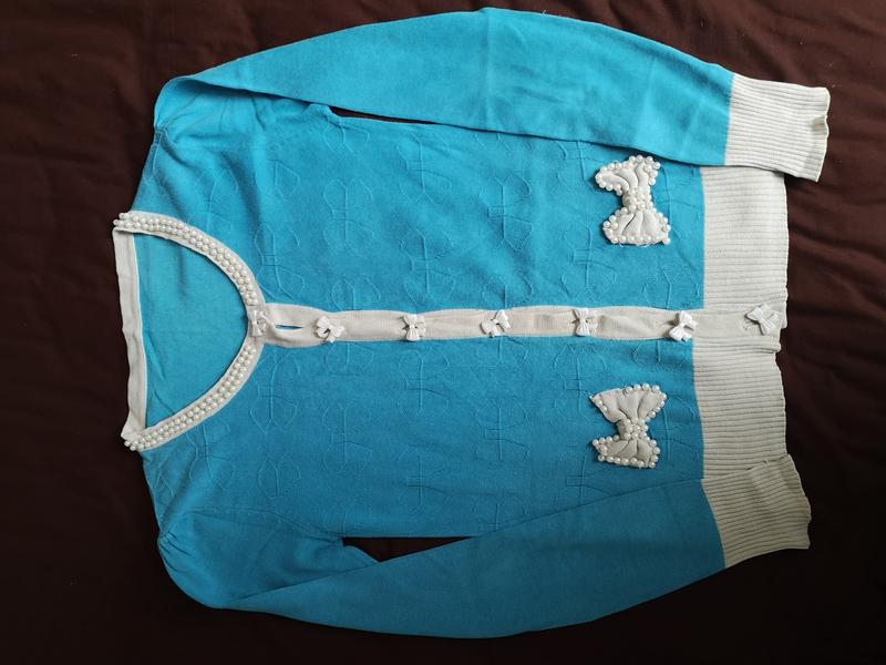 Мила кофточка на гудзиках у вигляді бантиків і перловим намистом. Розмір S. Є невеликий дефект на одному з бантиків бракує намистин. Більше дефектів немає. Доставка: Укрпошта, Нова Пошта. Оплата: 100% на картку Приватбанку. Порядність гарантую.