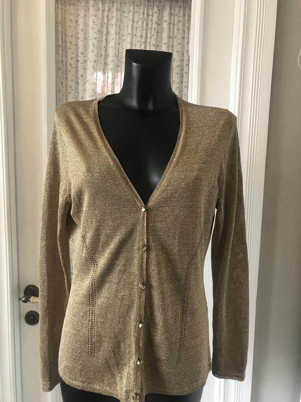 Гарна кофточка з люриксом від Apriori. Золотистий колір. Шикарна фурнітура, фасон. Але є нюанс:затягування ниток(див. Фото). Враховано бачені. Якщо не звертати увагу-дуже красива! Розмір на бірці-40.