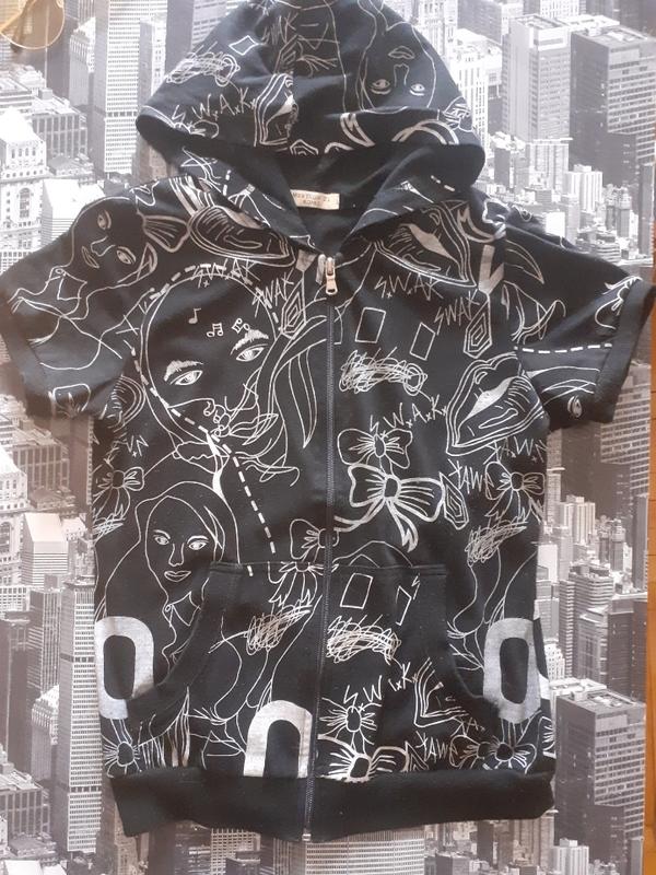 Кофта з коротким рукавом на блискавці з капюшоном. Актуальний принт "особи". Заміри, додаткові фото - в особистих повідомленнях. З задоволенням відповім на всі Ваші запитання.