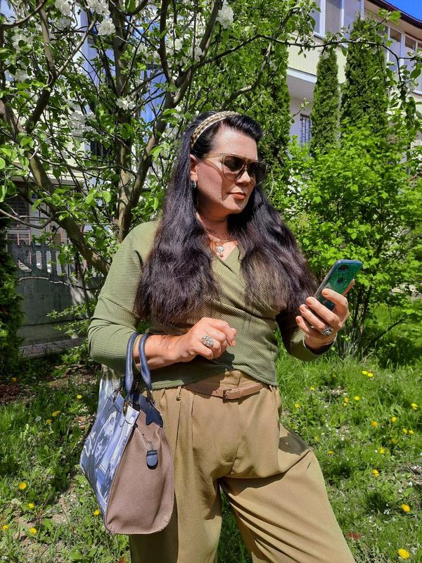 Бавовняна кофточка в рубчик приємного оливкового кольору. Імітація запаху. Спущений рукав три чверті. Заміри: довжина 66, напівобхват грудей 65, талії 46. Довжина рукава 69.