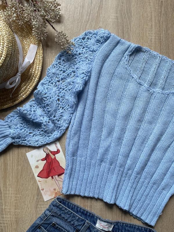 Ніжна блакитна блузка, гачковане мереживо В’язка м’ягка, легенька, можна носити і весною Гарно тягнеться Пог 50 Пот 37 Довжина 48 Рукав 56