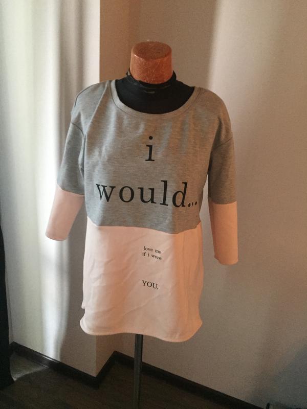 Ніжно-рожево-сірий світшот.На Розмір буде вільного крою,на М більше облягаючого.