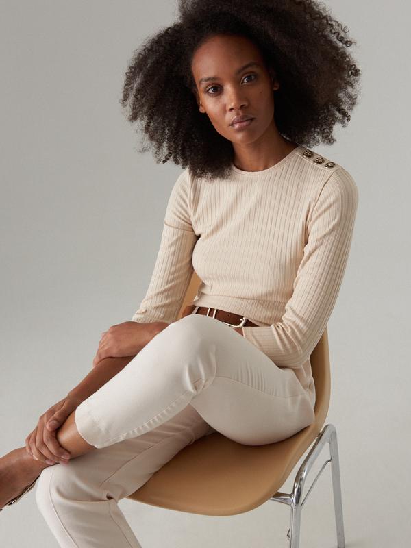 Бежевый джемпер в рубчик. Модель приталенная. На плече три золотые пуговицы. Состояние нового!
