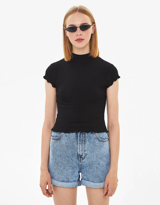 Базовий приталений джемпер/футболка в дрібний рубчик. Стильно виглядає в заправленому вигляді. Краще комбінувати з низом на високій посадці. Розмір вказано S. Тканина добре тягнеться, підійде на кілька розмірів. Стан нового!