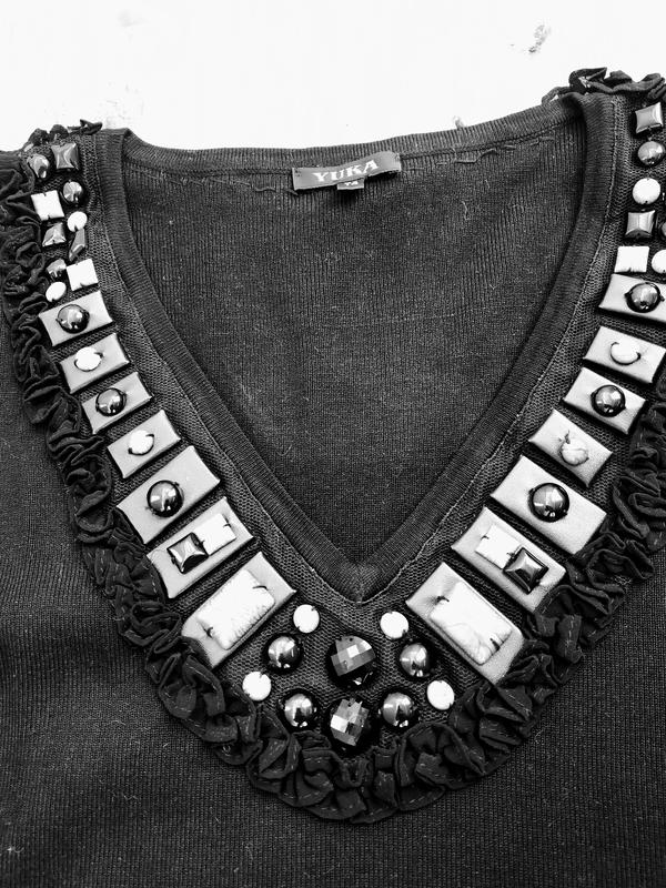 Цікавий джемпер чорного кольору з обробкою вздовж горловини, видно на фото. Колір чорний, яскравий. Розмір на бірці Т4, заміри ПОГ - 45, ПОТ-38, довжина -62cm, рукав -58см. добре тягнеться. не секонд.