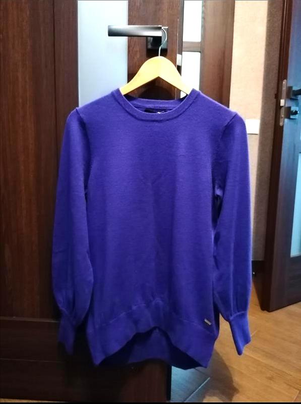 новый,с бирками ,цвет фиолетовый,ровномерный(фото4реал ный цвет) очень мягкий,красивый объемный рукав,уютный ,трикотаж эластичный,держит форму,передняя часть немного короче спинки, может быть на р46-48. Покупкой останетесь довольны.