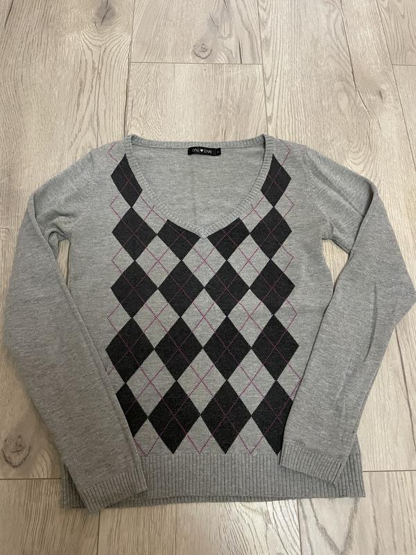 Сірий джемпер в ромбики, розмір М, не новий. V-образний виріз, тоненький, приємний до тіла.