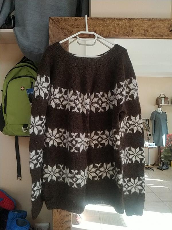 відмінна якість шість ручна робота привезений з Норвегії дуже теплий ,плечі реглан об'єм грудей 145 довжина 79 рукав від горловини 100