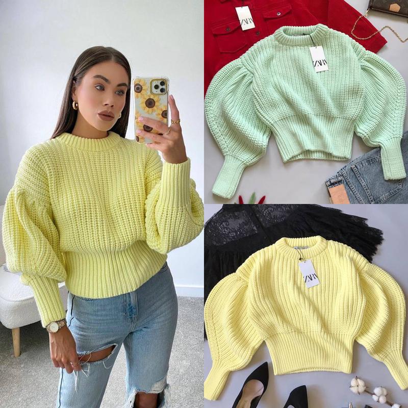 Шикарний з об'ємними рукавами джемпер великої в'язки, одягала один раз , розмір вказано S, але краще на М або навіть можна L. Довжина 57 см, ширина 50см.
