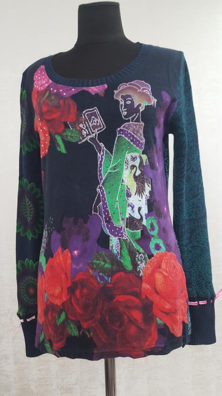 Стильный трикотажный джемпер от  мегапопулярного испанского молодёжного бренда модной одежды Desigual,что в переводе с испанского языка означает "уникальный".Буйство красок, испанская фиеста, бесконечный праздник и ласковое море – все это нашло отражение в нарядах одежды Desigual. Этот бренд для веселых, неординарных личностей, которые привыкли дарить позитив и жить на полную катушку. Джемпер выполнен из х/б трикотажа двух видов. Перёд и спинка из более тонкого трикотажа,рукава- из более плотного(как на свитер) трикотажа в рубчик. Декорирован вышивкой, стразами, кружевом ,фотопечатью. Размер L пог 46-49 см пот 40-43 см поб 43-49 см др 62.5 см ди 66 см Будет ещё много фирменных вещей. Подписывайтесь!  Имейте ввиду, что пока вы добавляете товар в ''избранное '',кто-то его уже покупает.И вы можете упустить свой шанс приобрести понравившуюся вещь. Дешевле покупать сразу несколько вещей-таким образом вы экономите на доставке. При покупке трёх и более вещей и оплате на карту продавцу сразу-- доставка бесплатная. Удачных и приятных покупок!.