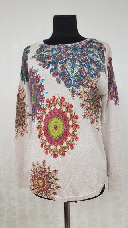 Нарядный джемпер с эффектным орнаментом от мегапопулярного испанского молодёжного бренда модной одежды Desigual,что в переводе с испанского языка означает "уникальный".Буйство красок, испанская фиеста, бесконечный праздник и ласковое море – все это нашло отражение в нарядах одежды Desigual. Этот бренд для веселых, неординарных личностей, которые привыкли дарить позитив и жить на полную катушку. Трикотаж тонкий,с мерцающим эффектом. Бирки срезаны. Могу предположить,что в составе вискоза Декорирован стразами. Размер М пог 50-56 см пот 46-52 см поб 47-53 см др 56 см ди 65 см Будет ещё много фирменных вещей. Подписывайтесь! Имейте ввиду, что пока вы добавляете товар в ''избранное '',кто-то его уже покупает.И вы можете упустить свой шанс приобрести понравившуюся вещь. Дешевле покупать сразу несколько вещей-таким образом вы экономите на доставке. При покупке трёх и более вещей и оплате на карту продавцу сразу-- доставка бесплатная. Удачных и приятных покупок!.