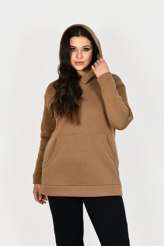 Худі із трикотажного полотна тринитка на флісі (Туреччина). З лицьової сторони тканина м‘яка і гладка, з вивороту - щільний начіс. Ростяжність тканини нижче середньої. Рекомендація по догляду: прання - автомат, в ручному режимі при температурі не вище 30 градусів. Джемпер прямого силуету з капюшоном. Рукав втачний на спущеній проймі. Попереду у рельєфних швах, дві кишені із трикотажної тканини.