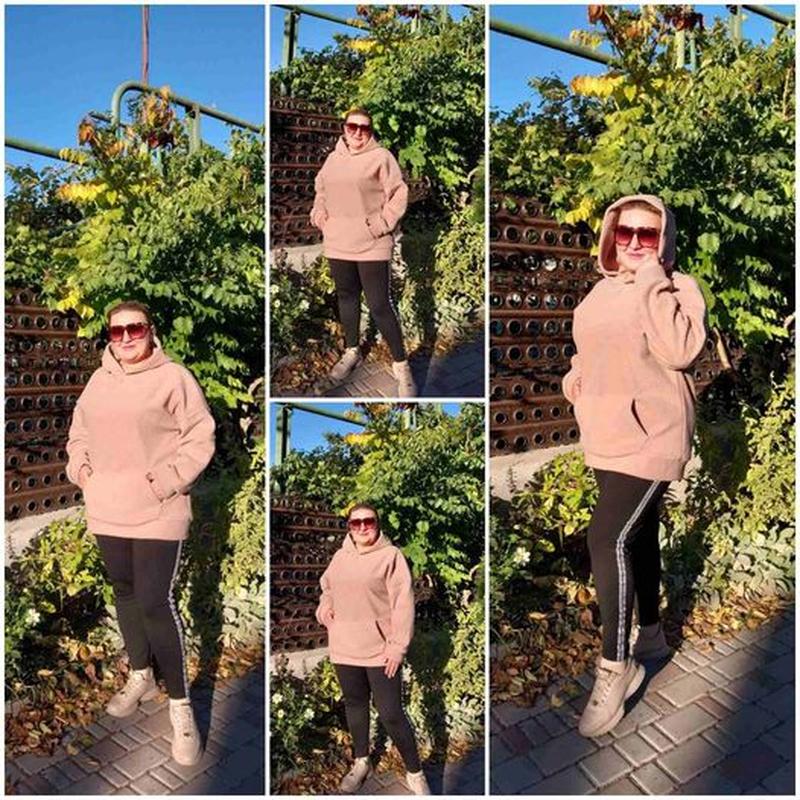 Нове Дуже теплий, як вовна овечки, щільністю як тринитка Фасон: подовжений, вільний, приспущений рукав, капюшон, кишені кенгуру, можна носити як вільним, так і більш обтислим Дуже гарний колір кави з молоком Розмір універсальний від 54 до 60, см. заміри Заміри: НОГ — 64 см (на обсяг грудей до 130 см, на 130 в обтягнення) піт — 60 см НОС — 60 см по низу по манжету — 60 см довжина по спинці — 78 см довжина рукава від горловини — 77 см Колір як на фото моделі