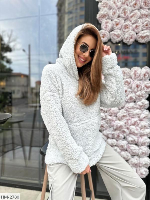 Худі HM-2780 Розміри: 42-44, 46-48 Светри, кофти Опис: кофта оверсайз,кенгуру - 1(42-44) ОГ 124 - 2(46-48) ОГ 130 Виміри зроблені по верх вироби, можливі відхилення кілька сантиметрів від замірів Тканина: об'ємний хутро баранець