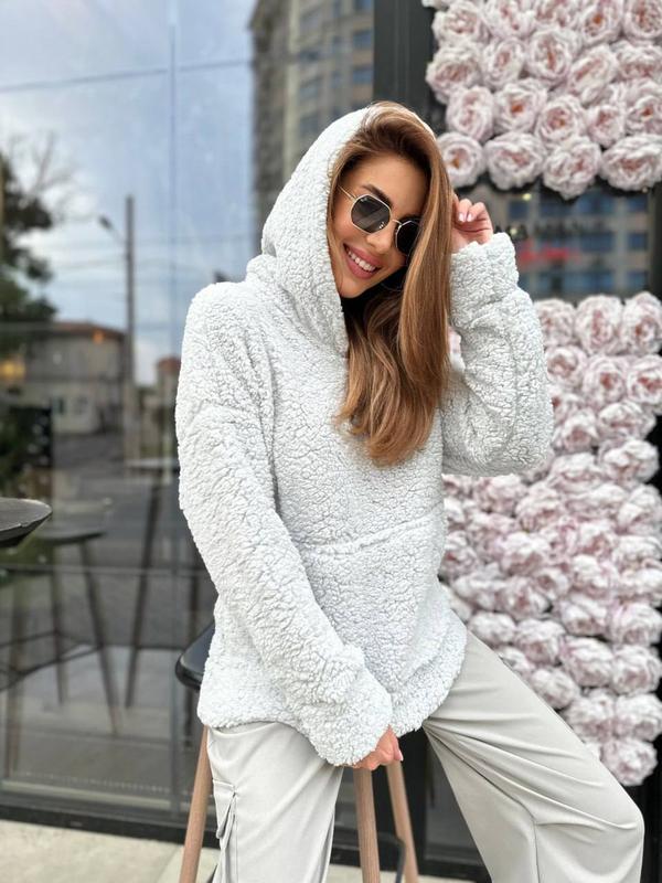 АН 7.10 Нова ціна на хіт Кофта жіноча Арт: 21/04/006 Розмір: 1(42-44) 2(46-48) Опис: кофта оверсайз,кенгуру - розмір 1(42-44) ОГ 124 - розмір 2(46-48) ОГ 130 Заміри зроблені по верх виробу, можливі відхилення декілька сантиметрів від вимірів Тканина: об'ємне хутро барашек