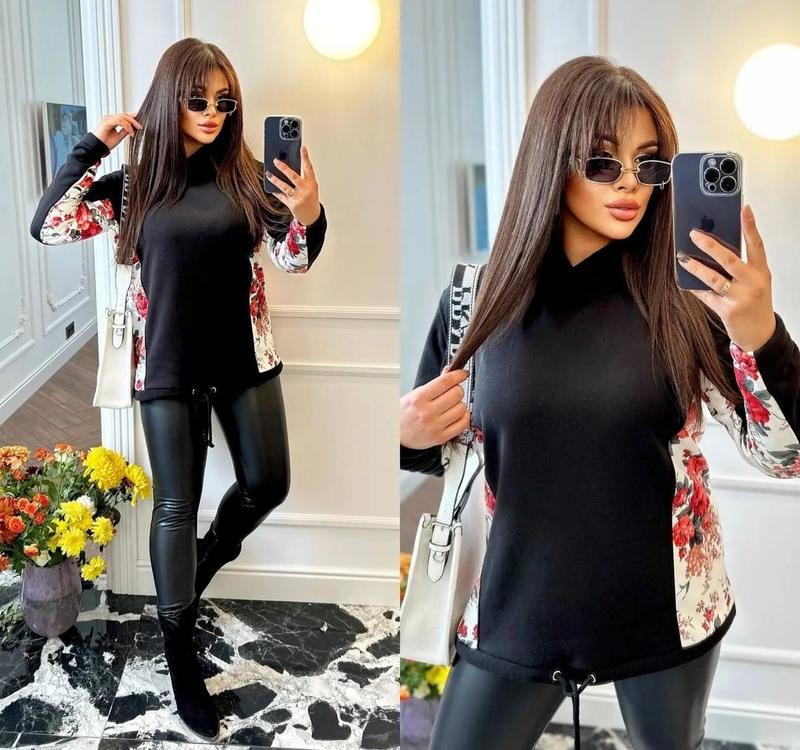Мод. 221 Дуже цікавий крій! Тканина: принт/трьохнитка на флісі. Принтована тканина, не накатка. Розміри: 48-52, 54-58 Кольори: чорний, бордо, молоко Знизу затягуєтеся шнурочком. Рукави на манжетах, капюшон.