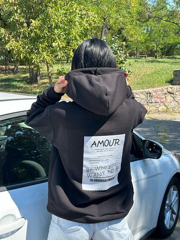 Тепле жіноче чорне худі із зовнішніми швами та романтичним принтом "amour" з тринитки на ф...