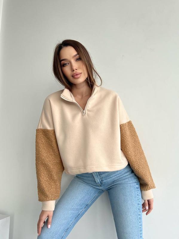 Батник зі вставками на рукавах #158 -1433 Тканина: трьохнитка на флісі, вставки із барашку Розміри :42-46 ( універсальний) Кольора:чорний, бежевий Ціна :455 грн Стильний , теплий батник з трьохнитки на флісі, знизу йде на резинці зі стопором Можна носити затягуючи знизу , а також в свободному виді