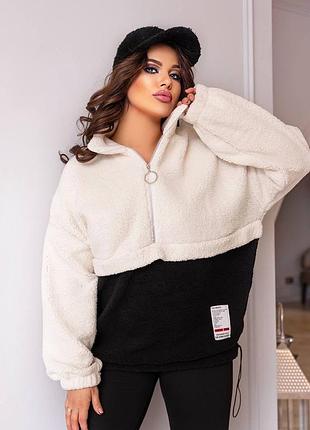 Стильний теплий худі-Тедді Код. 169 SS📍виробник Одеса Худі Тедді зі змійкою, воротником зі стійкою. З утяжкою по низу. - Кольори: молочно-Чорний, молочно-сірий. - Розміри: 48-52 , 54-58 - Параметри худі: 48-52: ОГ кофти: 130 см Низ кофти:130см Довжина: 75см Довжина рукава від горловини:74см 54-58 ОГ кофти: 140 см Низ кофти: 140см Довжина: 76см Довжина рукава від горловини: 74 см Тканина: Тедді 🛒ВІДПРАВКА протягом 3-7 робочих днів‼️