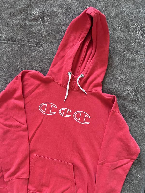 Худи Champion кораллового цвета. Размер на этикетке указан XS, но свободный в виде оверсайза, поэтому на М также будет по размеру