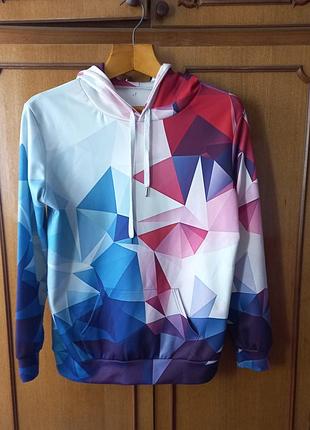 Яскраві фарби: від теплої червоної (рожевий, червоний, бузковий) до холодних блакитний, синій, фіолетовий ... на білому тлі. Бірка відсутня. Довжина 70 см Довжина рукава 64 см Ширина під рукавами 56 см Тканина щільна. Кишеня-кенгуру. Дефектів немає