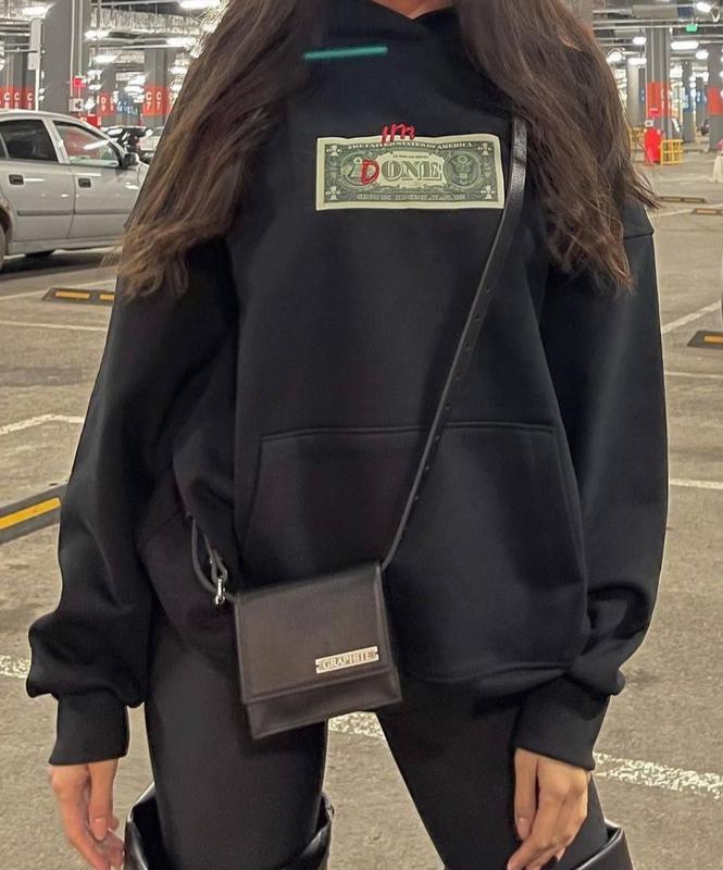 Худі з банкнотою долара I'm done. Нові худі не залишать тебе байдужою, ідеальна оверсайз посадка, приємна до тіла тканина гарної якості та стильний принт. Тканина: Турецька тринитка пеньє петля, манжети рібана, 100% бавовна. Розмір: 42-46 (універсальний). Колір: чорний.