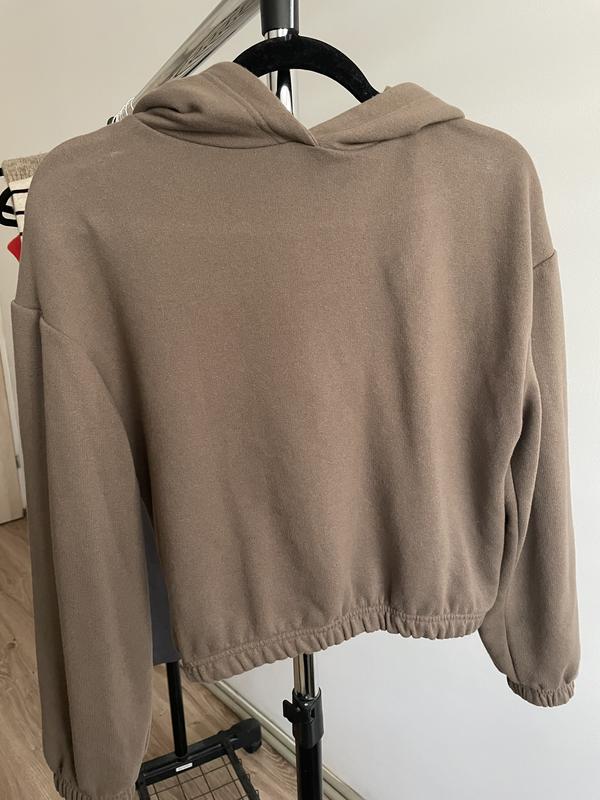 Внизу на резинці. Коротке,одягнуто на зріст 154 см. Довжина по спинці 46 см. Йде oversized. Капюшон великий.