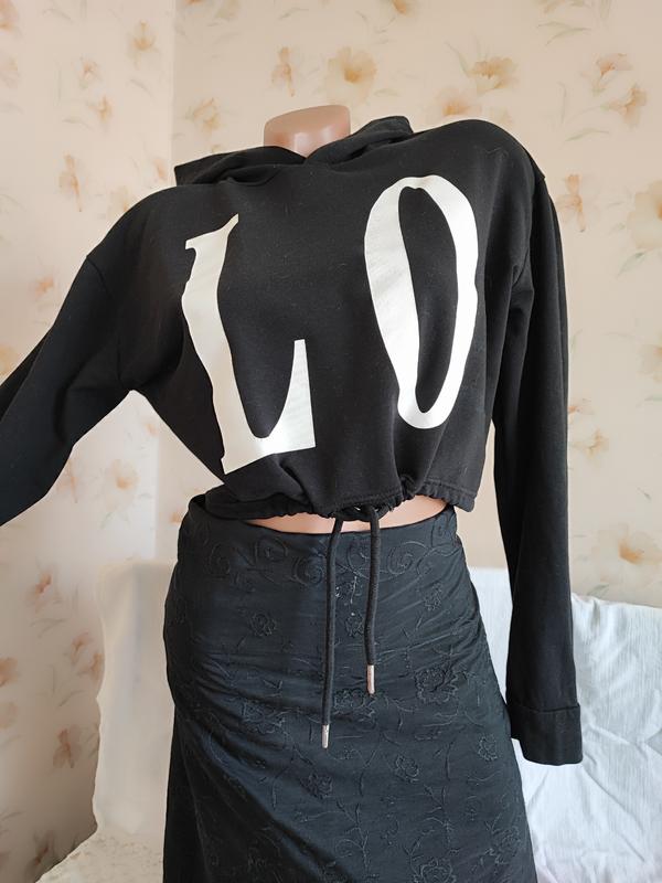 Укороченное худи с капюшоном чёрного цвета, снизу на шнурок. В плечах 50 см., спущенная пройма. Рукава с манжетами, длина от плеча 56 см. Качественный трикотаж, натуральная ткань. Отличный стильный вариант для спортивных образов. Можно объединять с повседневными брюками или спортивными в аналогичном цвете. Смотрится очень эффектно и стильно. Состояние новой вещи. Дефектов нет.