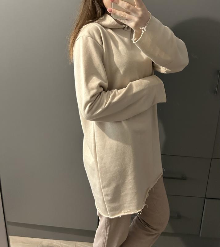 Удлиненное худи не с обработанными краями Сток с лейбой новое Цвет бег с розовым оттенком По бирке размер ХЛ облачен на С Длина от капюшона-79 см Полу обхват груди-53 см до 65 см тянется Рукав от горлишка-73 см
