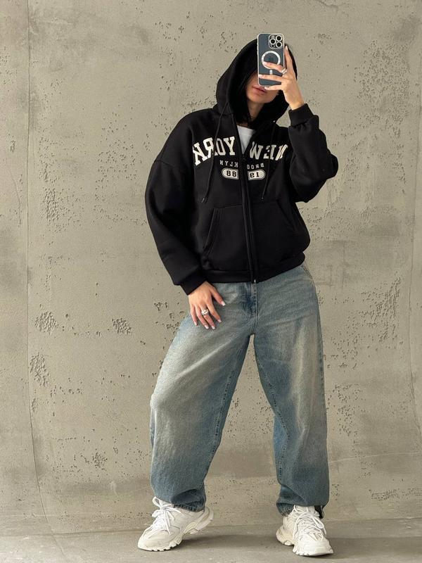 🕊️Худі на блискавці з якісним принтом - «New York» Манжети з основної тканини. •Мод: 150 •Колір: чорний •Розмір: 42-46 oversize •Тканина: якісна трьохнитка на флісі