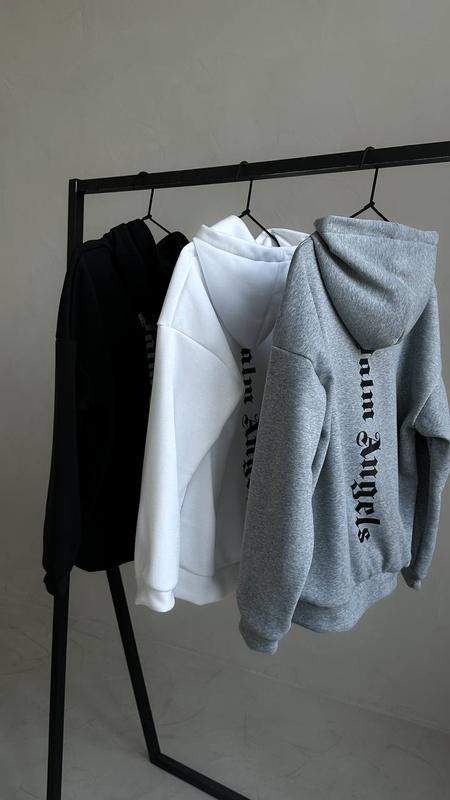 Крутезні трендові теплі худі «Palm Angels», Туреччина. Тканина: турецька трьохнитка на флісі. Кольори: чорний, білий, меланж. Якісний принт. Манжети з основної тканини. Розмір єдиний: 42-48 (oversize). ЗАМІРИ: Довжина 65 см. Об'єм грудей 118 см. Рукав від ворота 73 см.