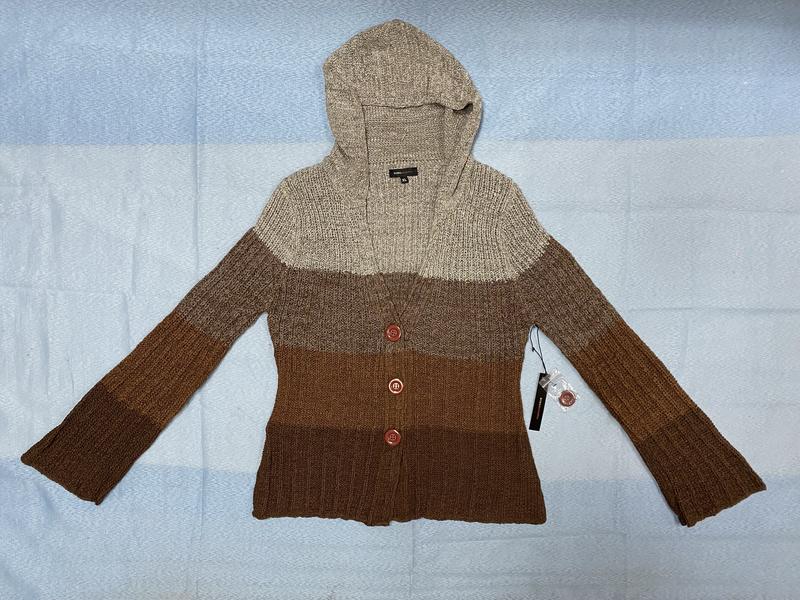 Кофта жіноча з капюшоном американського бренду BCBG Maxazria , виконаний в коричнево -кофейних кольорах , виробництво Китай, матеріал ( щільний , стейчевий ) : 67% акрил , 33% нейлону ! Товста вʼязка , збільшена V-подібна горловина на 3-х ґудзиках , розширений рукав ! Розмір: US (XL) : ширина ( в груді ) - 45 см, довжина (перед) - 35 см, довжина (спина) - 62 см, рукав ( від шва плеча ) - 68 см , рукав ( від шва пройми ) - 44 см , плечі ( довжина між швами плечей ) - 39 см . Заміри довжини з переду - від кута мису , зі спини - від шва капюшона !