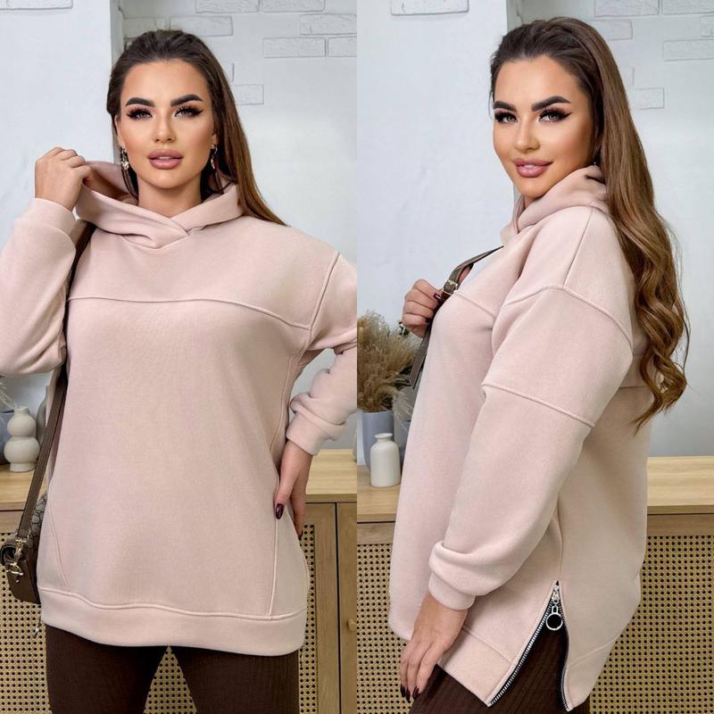 Худи НОВИНКА💥💥💥 В НАЯВНОСТІ✅✅✅ Код 3767 (филат) Ткань: трехнитка на флисе. Цвета: марсала, черный, шоколад, персик, зеленый. Размеры: 52-54, 56-58, 60-62, 64-66. Длина худи: 75, 76, 77, 78 см. Длина рукава от горл: 71, 72, 73, 74 см. Обхват рукава: 44, 46, 48, 50 см. Замеры готового изделия: 52-54 ОГ 120 ОТ 116 ОБ 118 56-58 ОГ 128 ОТ 124 ОБ 126 60-62 ОГ 136 ОТ 132 ОБ 134 64-66 ОГ 144 ОТ 140 ОБ 142 Невероятно стильное худи из трикотажа трехнитки с начесом (средняя растяжимость). Худи имеет прямой свободный силуэт и капюшон. Линия плеча спущена, рукава на манжетах. Внизу по бокам расположены функциональные молнии, которые можно расстегнуть для создания более интересного образа. Карманов нет.