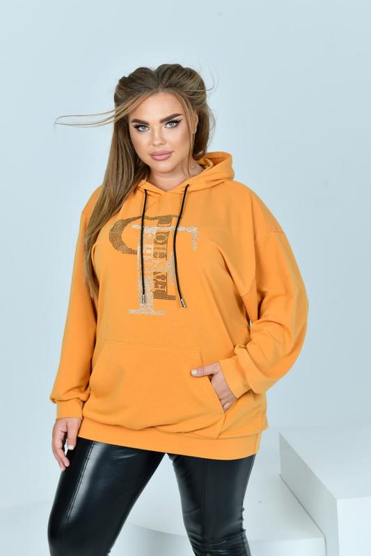 Худи НОВИНКА💥💥💥 Код 3644 Цена 900 грн. Тканина: двонитка. Цвет: марсала, хаки, графит, черный, фиолетовый, горчица, ярко-синий, мокко. Размеры: 48-50, 52-54, 56-58, 60-62, 64-66. Длина худи: 73, 74, 75, 76, 77 см. Длина рукава от горл.: 72, 73, 74, 75, 76 см. Обхват рукава: 54, 56, 58, 60, 62 см. Замеры готового изделия: 48-50 ОГ 120 ОТ 116 ОБ 116 52-54 ОГ 128 ОТ 124 ОС 124 56-58 ОГ 136 ОТ 132 ОС 132 60-62 ОГ 144 ОТ 140 ОС 140 64-66 ОГ 152 ОТ 148 ОС 148 Невероятно стильное и в то же время очень удобное худи из трикотажа двунитки ( растяжимость средняя). Худи с двойным капюшоном, в кулиску которого продет шнурок. Спереди накладной карман «кенгуру». Линия плеча спущена, рукава на манжетах. На передней полочке стильная аппликация из качественных страз. філат