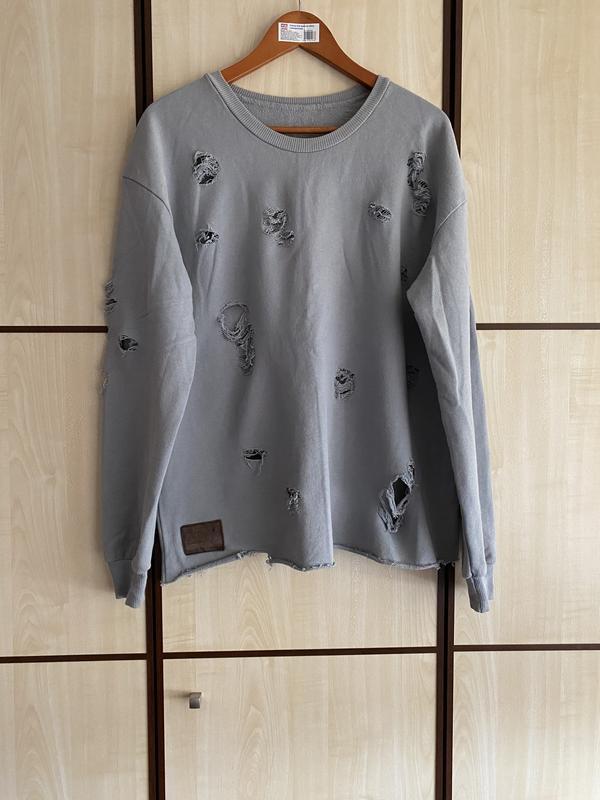 Свитшот брендовый с декоративными разрывами. Длина 70 см, плечи спущены - 66 см, по груди 63, по низу 64, рукав 60. Фасон оверсайз. На последнем фото нюанс - немного сошла краска в обамти плеча, почти незаметно, так и было при покупке. В цене учтено