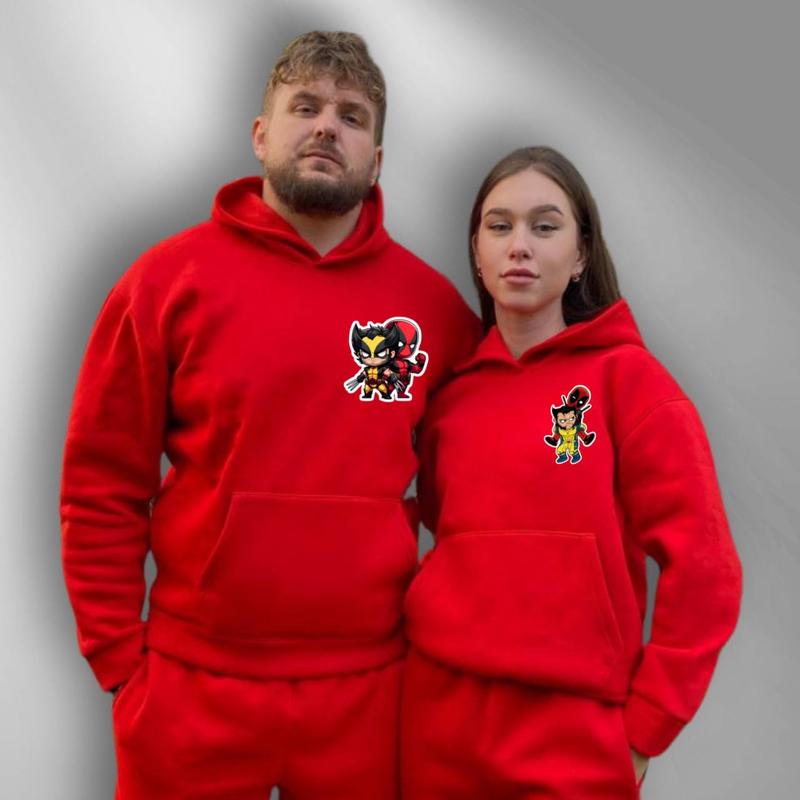 Парные худи с капюшоном утепленные, принт "дедпул и россомаха", красный (366)