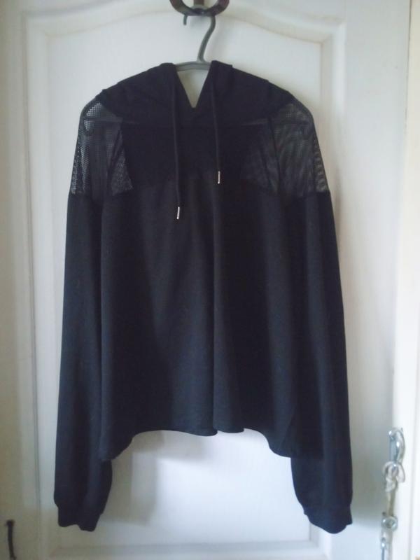 Худі широке, оверсайз, з плотного чорного трикотажу без начосу. Особливість моделі - сітчаста вставка на плечах. Рукав реглан. Заміри на фото.